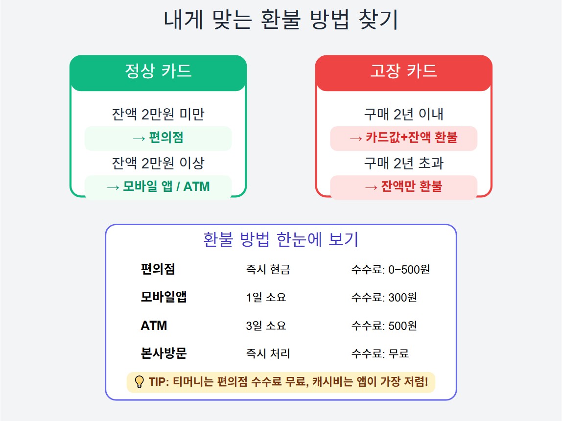 🔥 수수료 절약법: 티머니는 편의점 무료 환불, 캐시비는 모바일 앱이 저렴