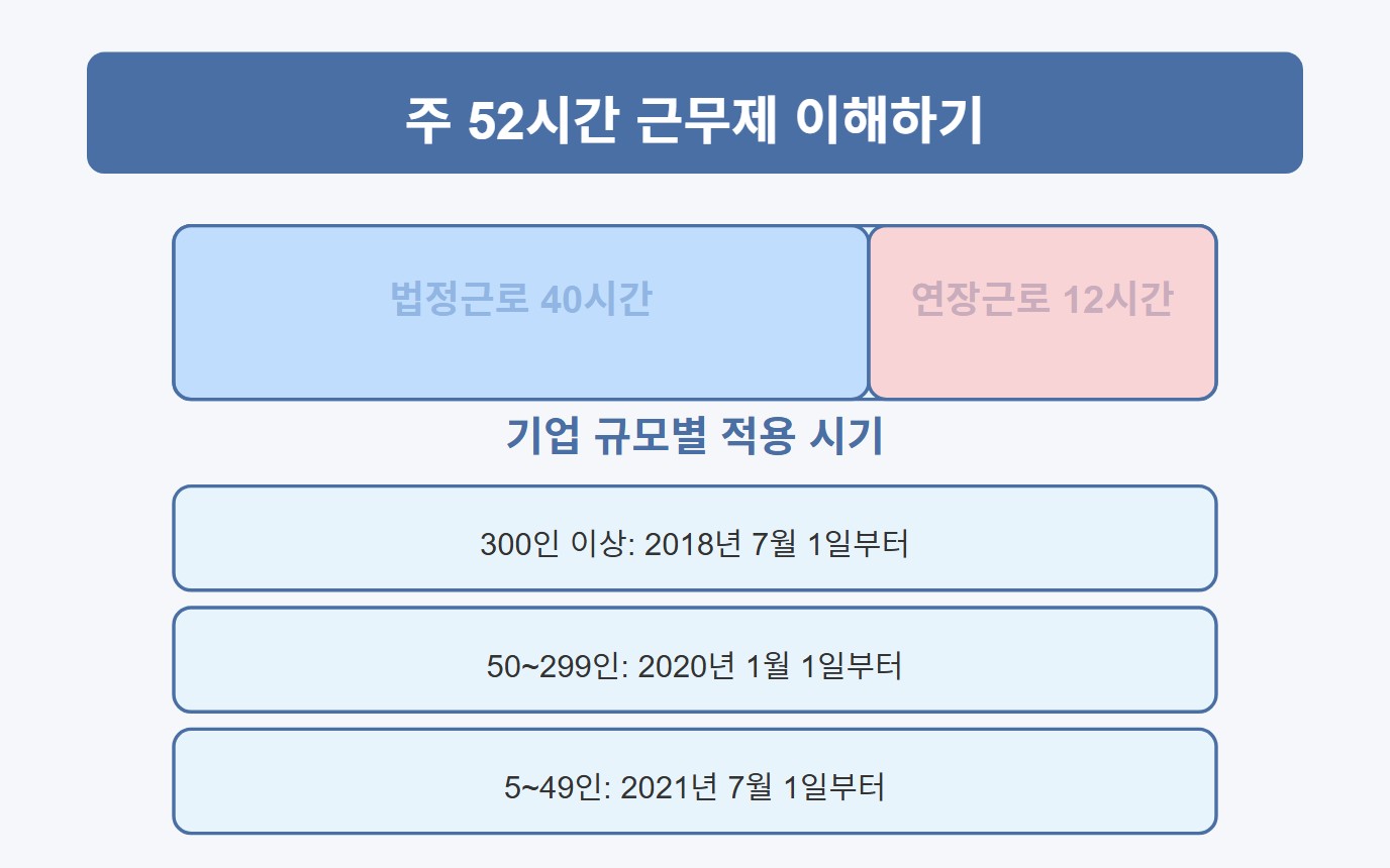 주 52시간 근무제는 1주일 최대 근로시간을 52시간(법정근로 40시간 + 연장근로 12시간)으로 제한하는 제도입니다.