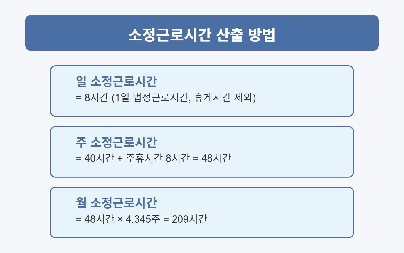 | 월 소정근로시간 | 주 소정근로시간 × 월 평균 주수 | 48시간 × 4.345주 = 209시간 |