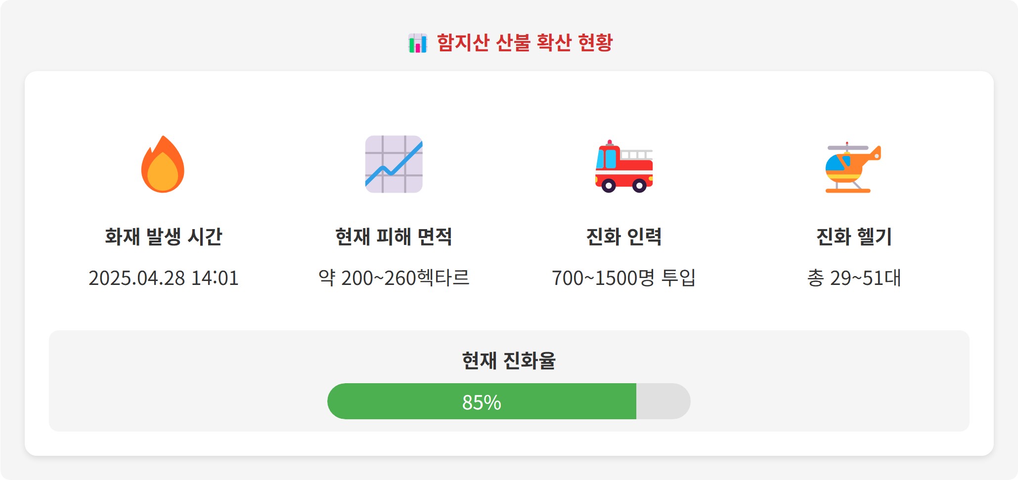 소방당국에 따르면 현재 진화율은 약 82~92% 수준으로, 산불 진화 헬기와 소방인력이 총동원되어 진화작업 중입니다.