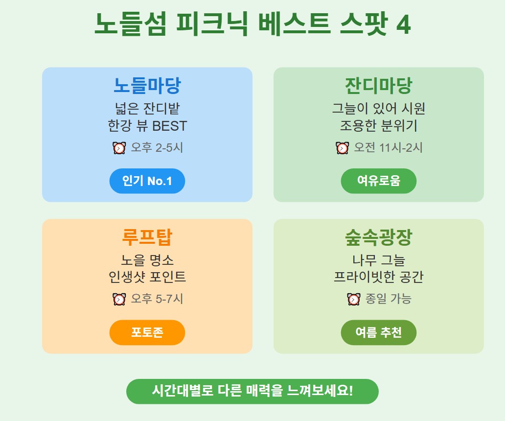 | 장소명 | 특징 | 추천 시간대 | 추천 이유 |