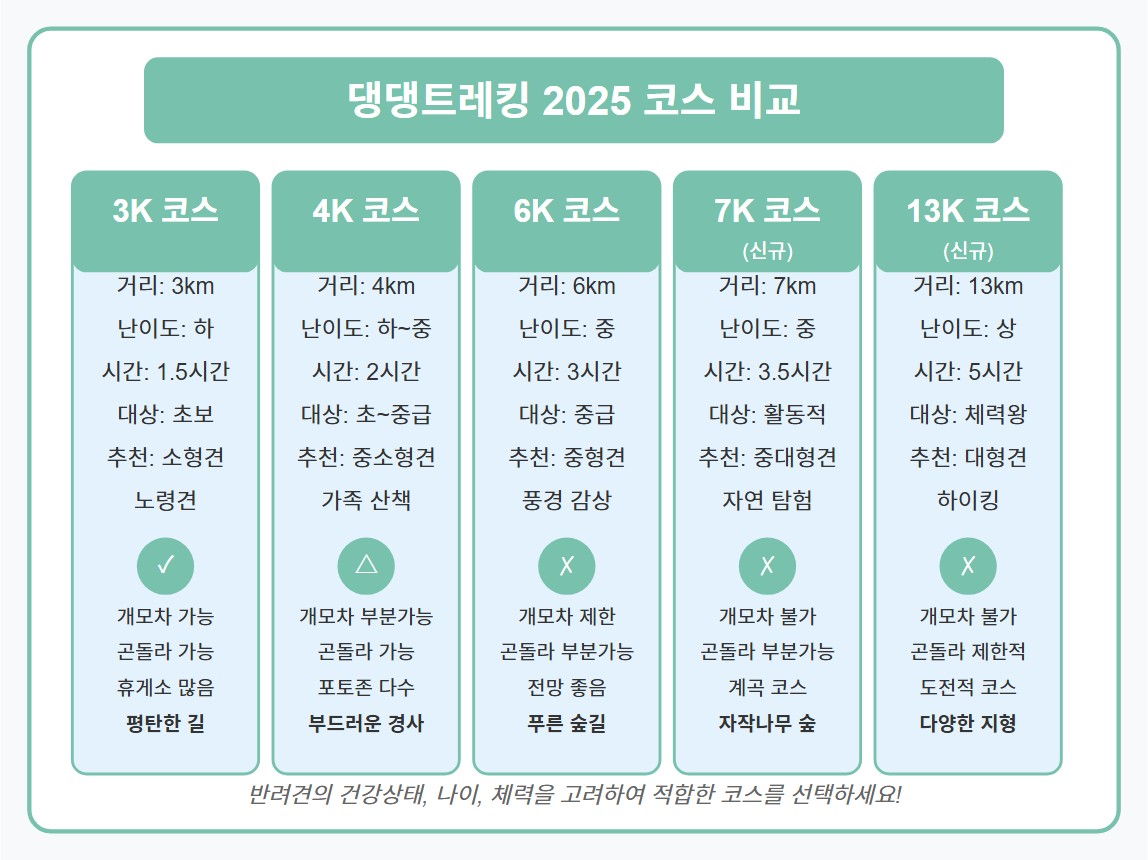 | 7K(신규) | 7 | 중 | 활동적 견주, 건강한 중대형견 | 자작나무 숲길, 물가 코스 포함 |