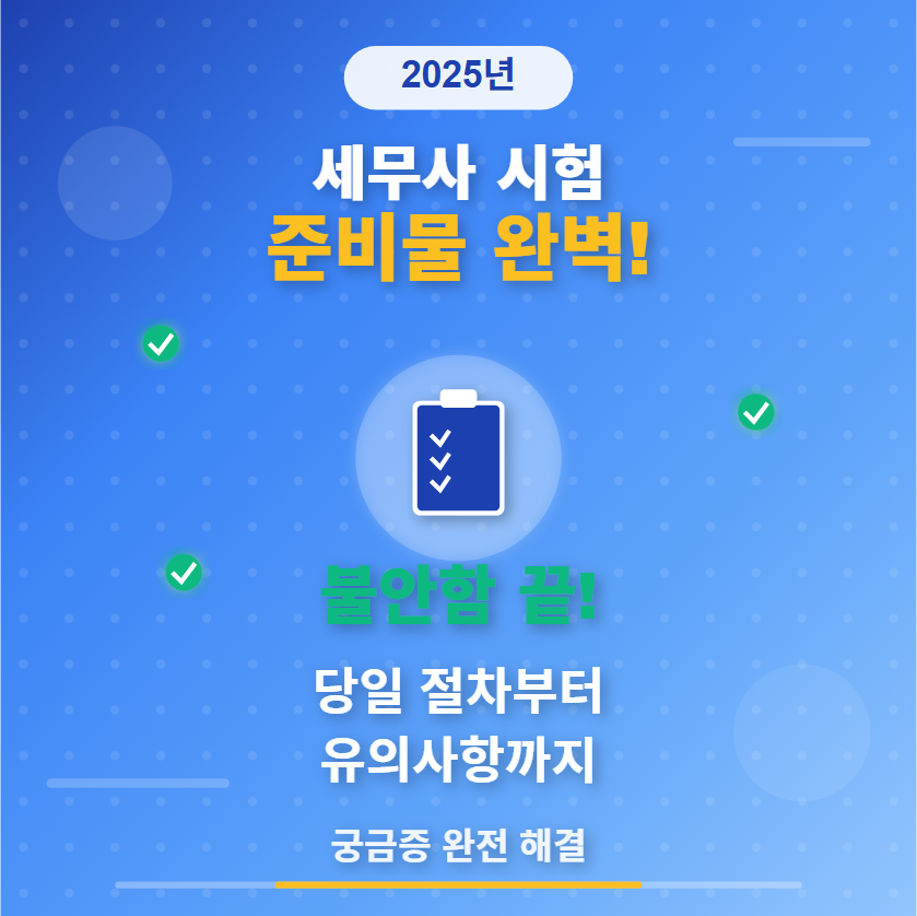2025년 세무사 시험을 준비하는 모든 수험생분들께, 철저한 준비물 점검과 시간 관리, 마음 관리가 가장 중요하다는 점을 다시 한 번 강조합니다.