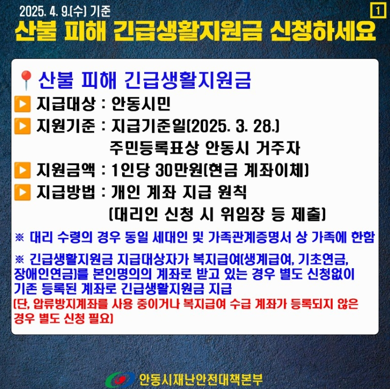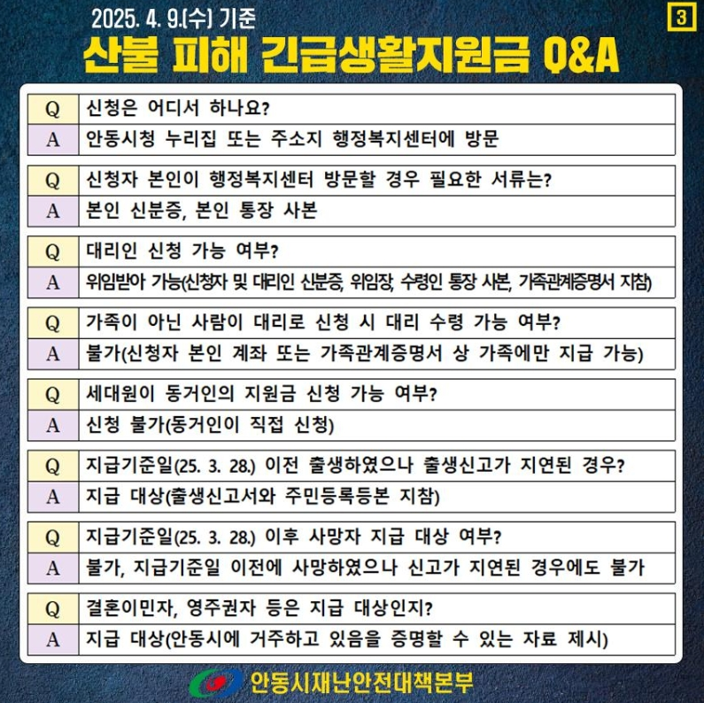 - 경북도 지원: 피해 유무와 상관없이, 2025년 3월 28일 기준 안동시에 주민등록이 되어 있는 시민이라면 모두 받을 수 있습니다