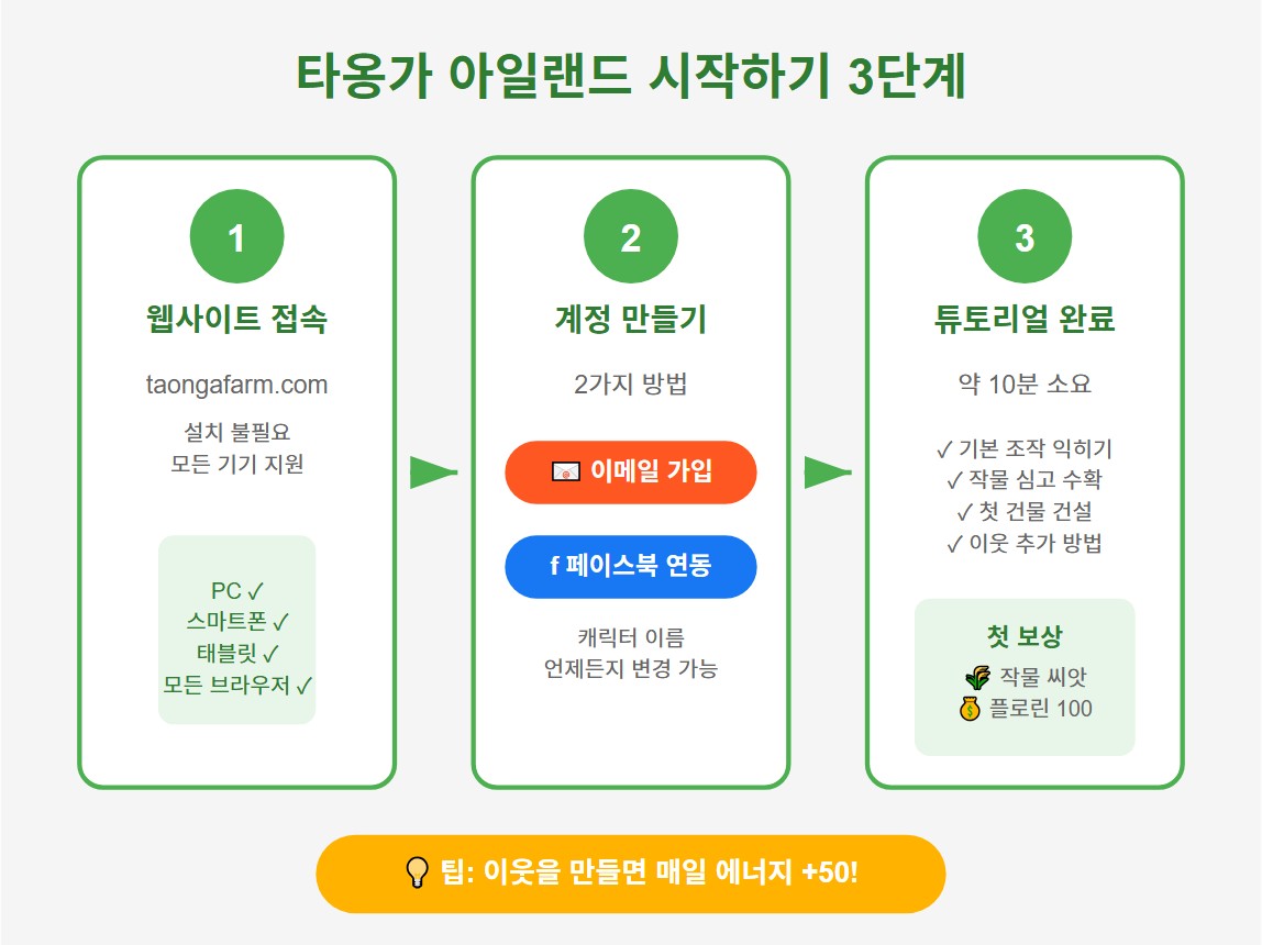 타옹가 아일랜드는 설치 없이 웹브라우저에서 바로 플레이하는 무료 농장 시뮬레이션 게임입니다.