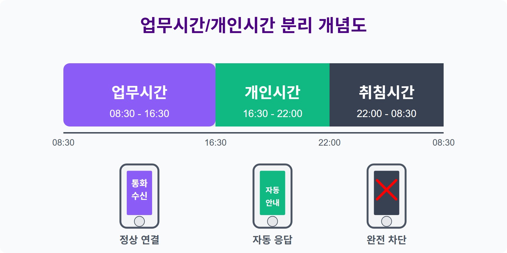 | 방과후/주말 연락 | 24시간 통화/문자 수신 | 업무시간 외 자동 차단 | 업무-개인 생활 균형 확보 |