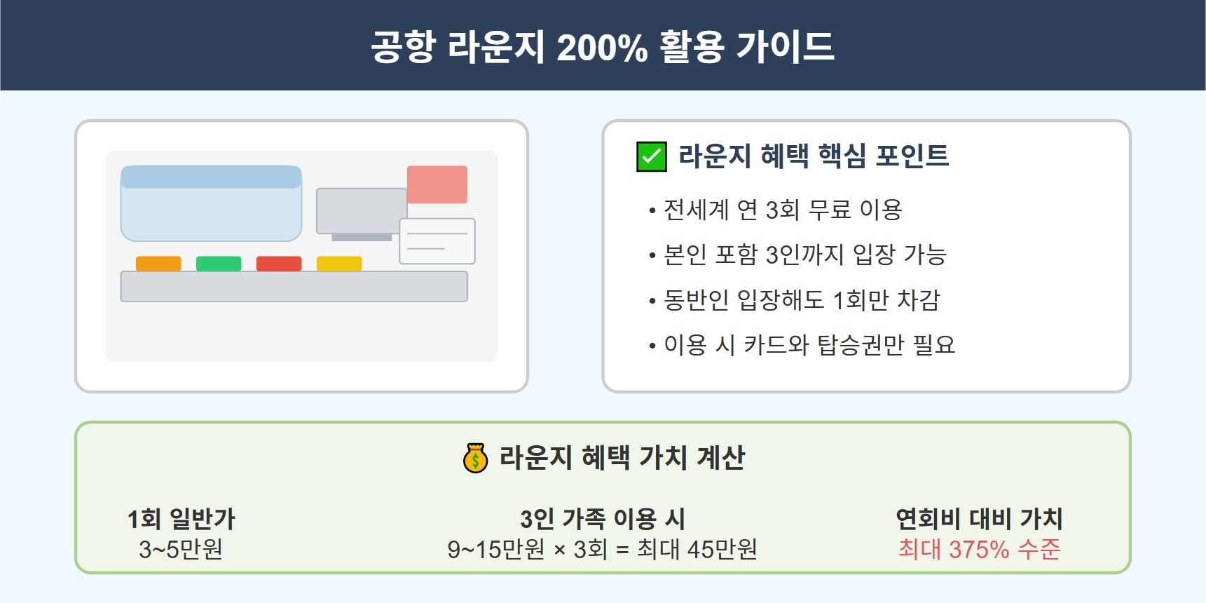 💼 해외 출장多: 공항 라운지 3회면 대부분의 출장에 충분한 활용 가능