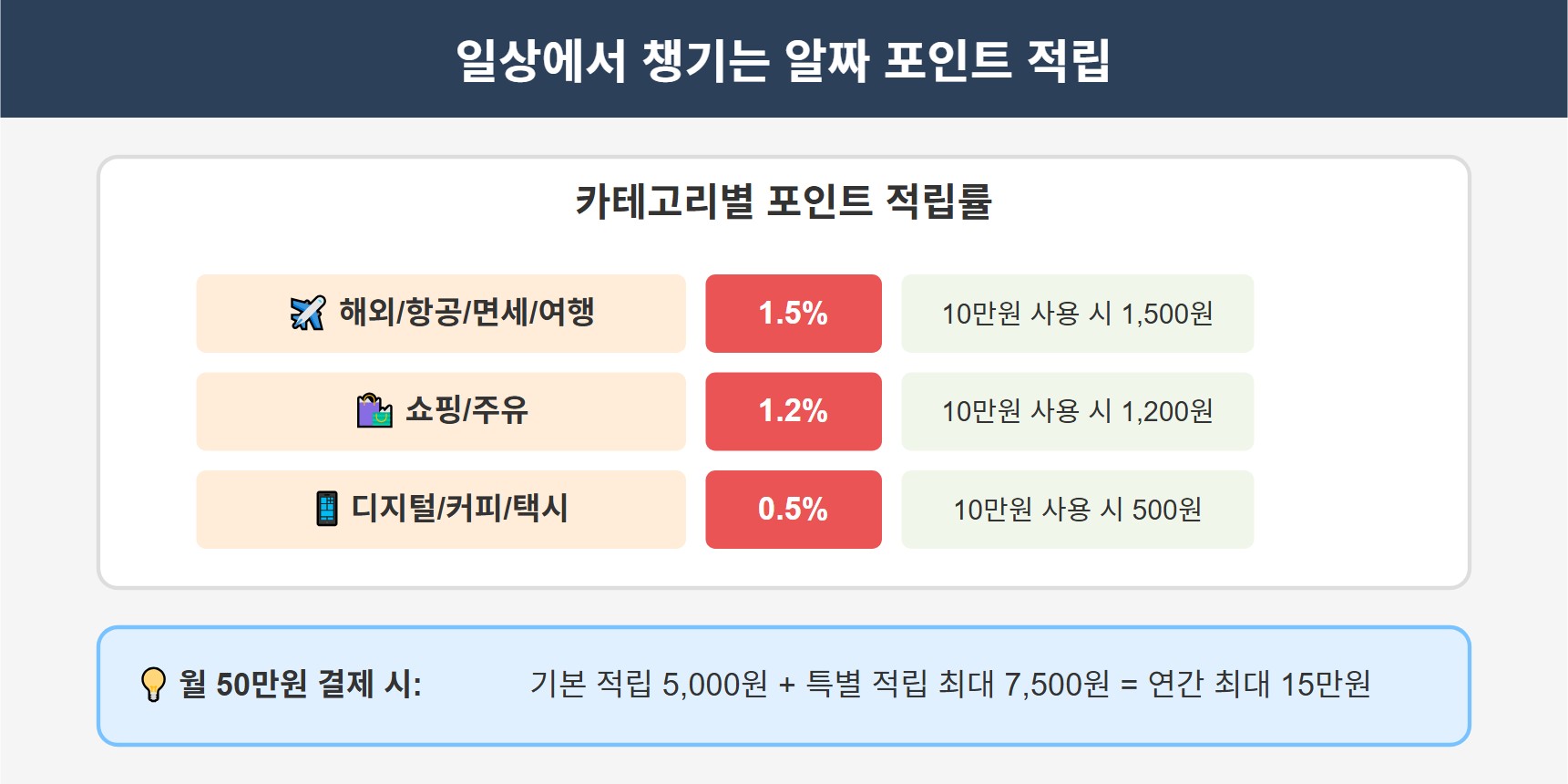 ✅ 포인트 적립: 기본 1% + 특정 가맹점 1.5%