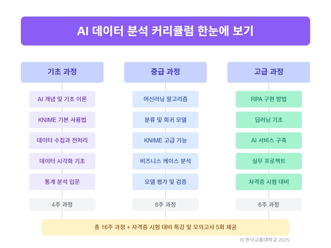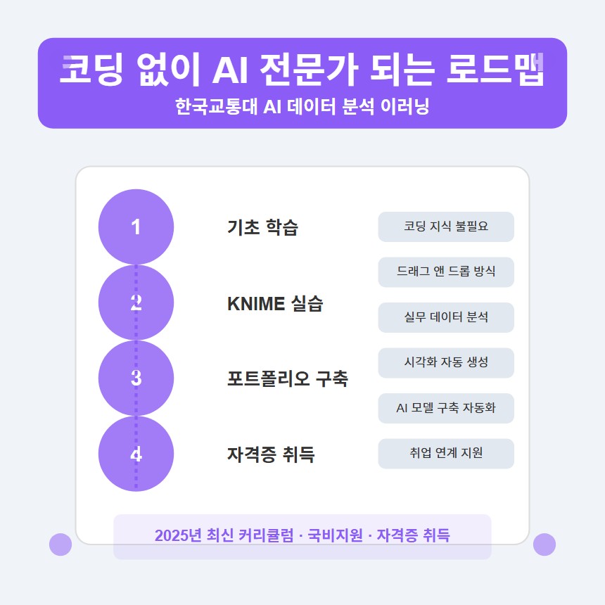 2025년 한국교통대 AI 데이터 분석 과정의 가장 큰 특징은 KNIME 노코드 플랫폼을 활용한다는 점입니다.