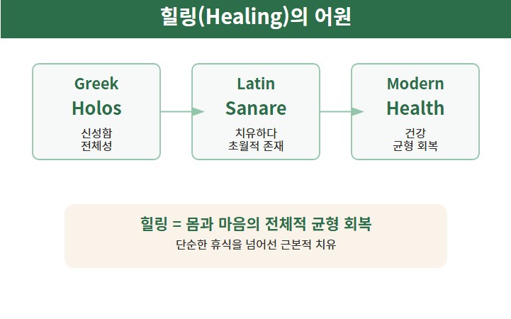 힐링(Healing)의 어원 Greek Holos 신성함 전체성 Latin Sanare 치유하다 초월적 존재 Modern Health 건강 균형 회복 힐링 = 몸과 마음의 전체적 균형 회복 단순한 휴식을 넘어선 근본적 치유