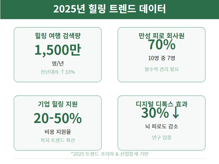2025년 힐링 트렌드 데이터 힐링 여행 검색량 1,500만 명/년 전년대비 ↑33% 만성 피로 회사원 70% 10명 중 7명 필수적 관리 필요 기업 힐링 지원 20-50% 비용 지원율 복지 트렌드 확산 디지털 디톡스 효과 30%↓ 뇌 피로도 감소 연구 입증 *2025 트렌드 코리아 & 산업통계 기반