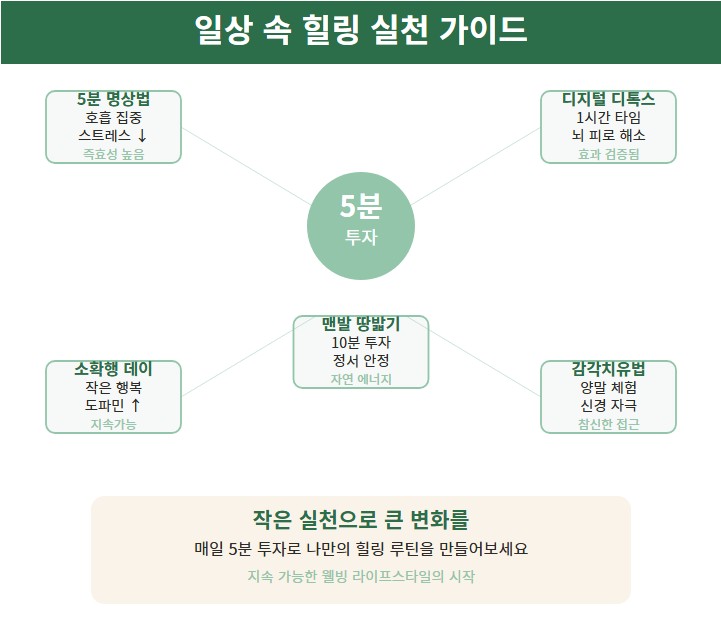 일상 속 힐링 실천 가이드 5분 투자 5분 명상법 호흡 집중 스트레스 ↓ 즉효성 높음 소확행 데이 작은 행복 도파민 ↑ 지속가능 디지털 디톡스 1시간 타임 뇌 피로 해소 효과 검증됨 감각치유법 양말 체험 신경 자극 참신한 접근 맨발 땅밟기 10분 투자 정서 안정 자연 에너지 작은 실천으로 큰 변화를 매일 5분 투자로 나만의 힐링 루틴을 만들어보세요 지속 가능한 웰빙 라이프스타일의 시작