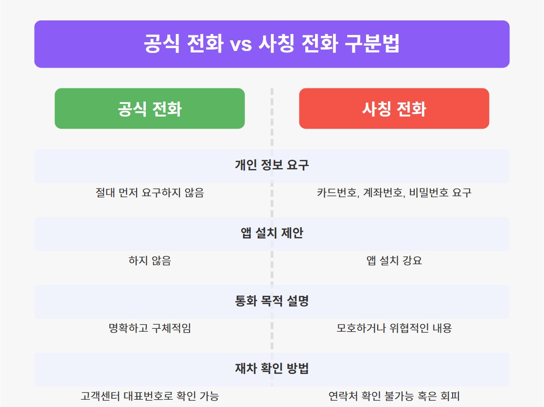 | 개인 정보 요구 | 절대 먼저 요구하지 않음 | 카드번호, 계좌번호, 비밀번호 요구 |