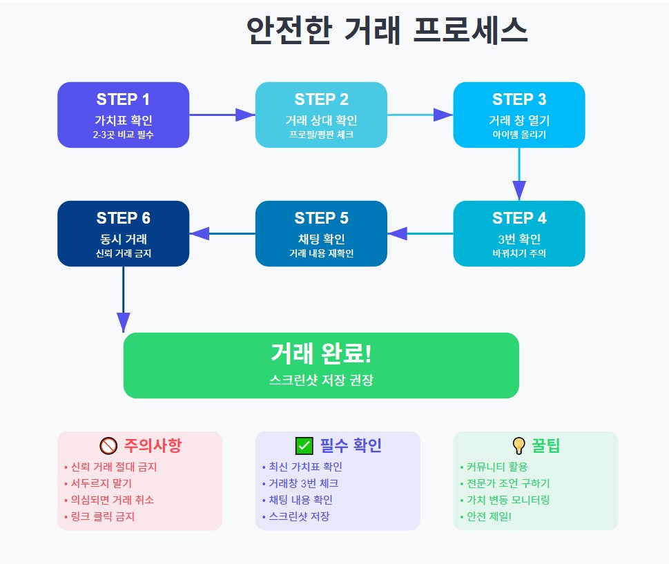 | 거래 창 확인 | 양쪽 거래 아이템 3번 이상 확인 | 마지막 순간 바꿔치기 주의 |