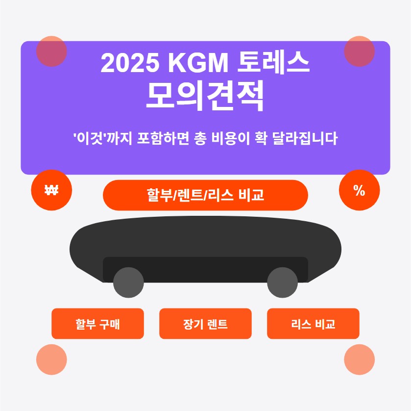 이번 글에서는 2025년 KGM 토레스의 트림별 가격과 부가 비용, 구매 방법 비교 등을 통해 총 구입 비용을 분석하고, 할부, 렌트, 리스 등 다른 이용 방식의 장단점을 비교해 보겠습니다.