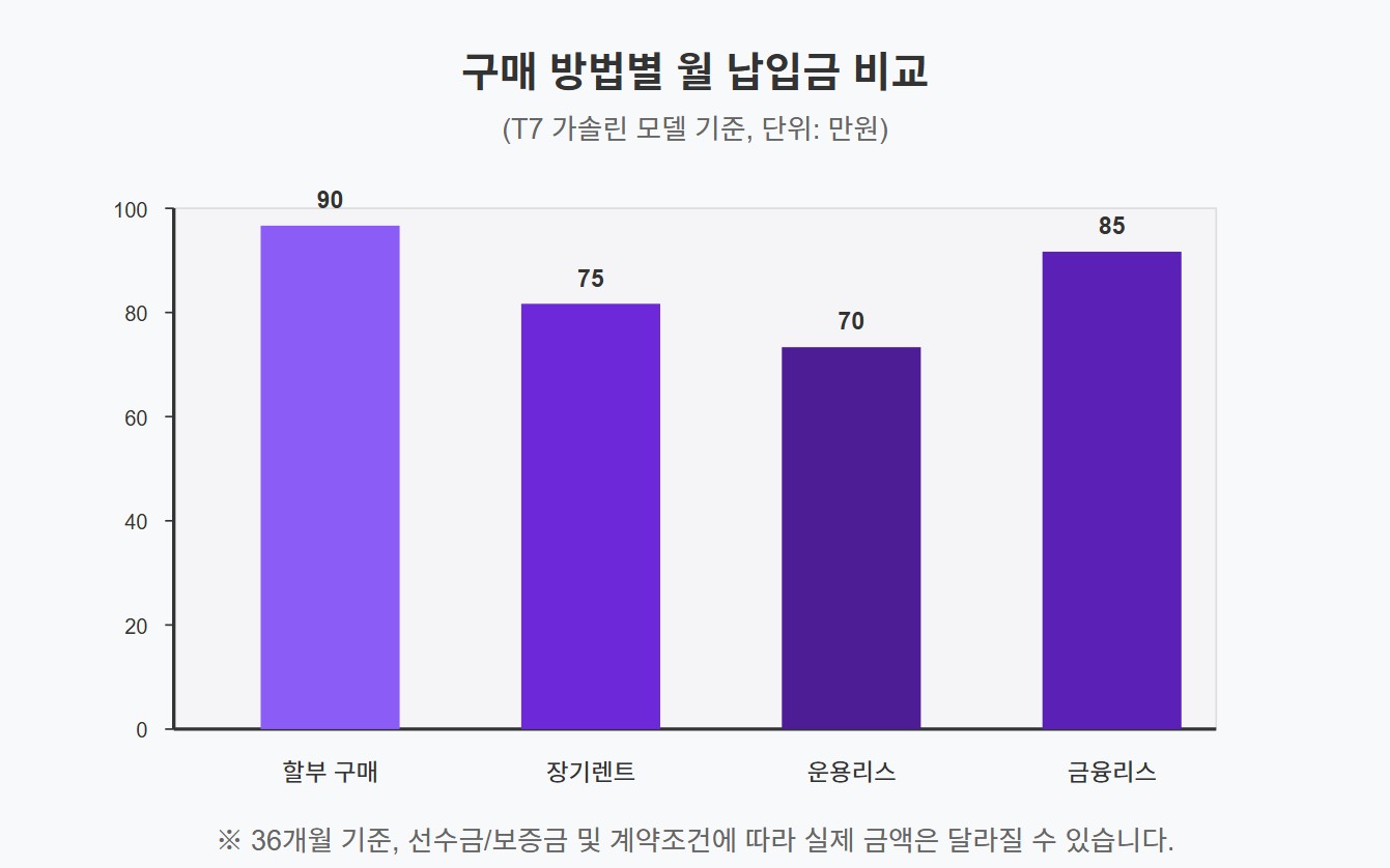 방식별 월 부담금 비교 (T7 가솔린 모델 기준)